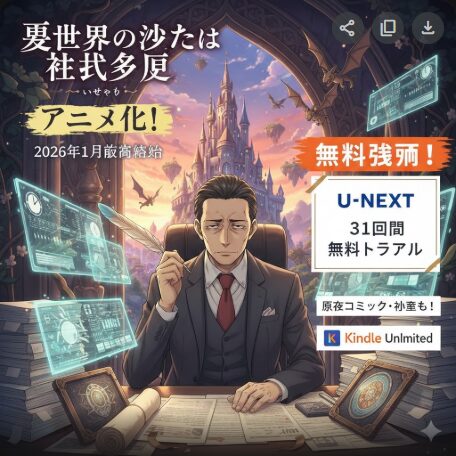 アニメ「異世界の沙汰は社畜次第」を無料で見れる配信サービスを徹底比較。U-NEXT、DMM TV、dアニメストアなど全サブスクを網羅。Kindle Unlimitedで漫画1〜3巻・小説1巻が読み放題対象。30日間無料体験でお得に楽しめます。