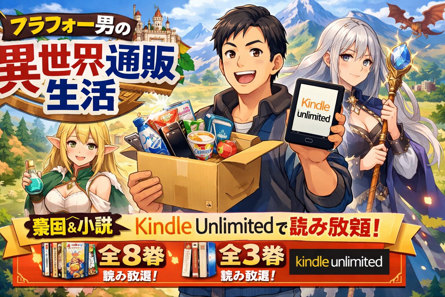 「アラフォー男の異世界通販生活」は、異世界転移×ネット通販スキルというユニークな設定と、等身大のアラフォー主人公の奮闘が楽しめるなろう系作品です。累計発行部数130万部を突破し、2025年にはTVアニメ化も果たした人気作品ながら、漫画版全8巻と小説版全3巻がいずれもKindle Unlimited読み放題の対象となっています。