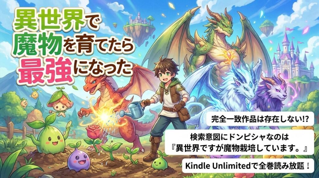「異世界で魔物を育てたら最強になった」というキーワードで作品を探している方に結論からお伝えします。このタイトルと完全一致する作品は存在しませんが、検索意図にぴったりの作品「異世界ですが魔物栽培しています。」がKindle Unlimitedでラノベ版全6... -