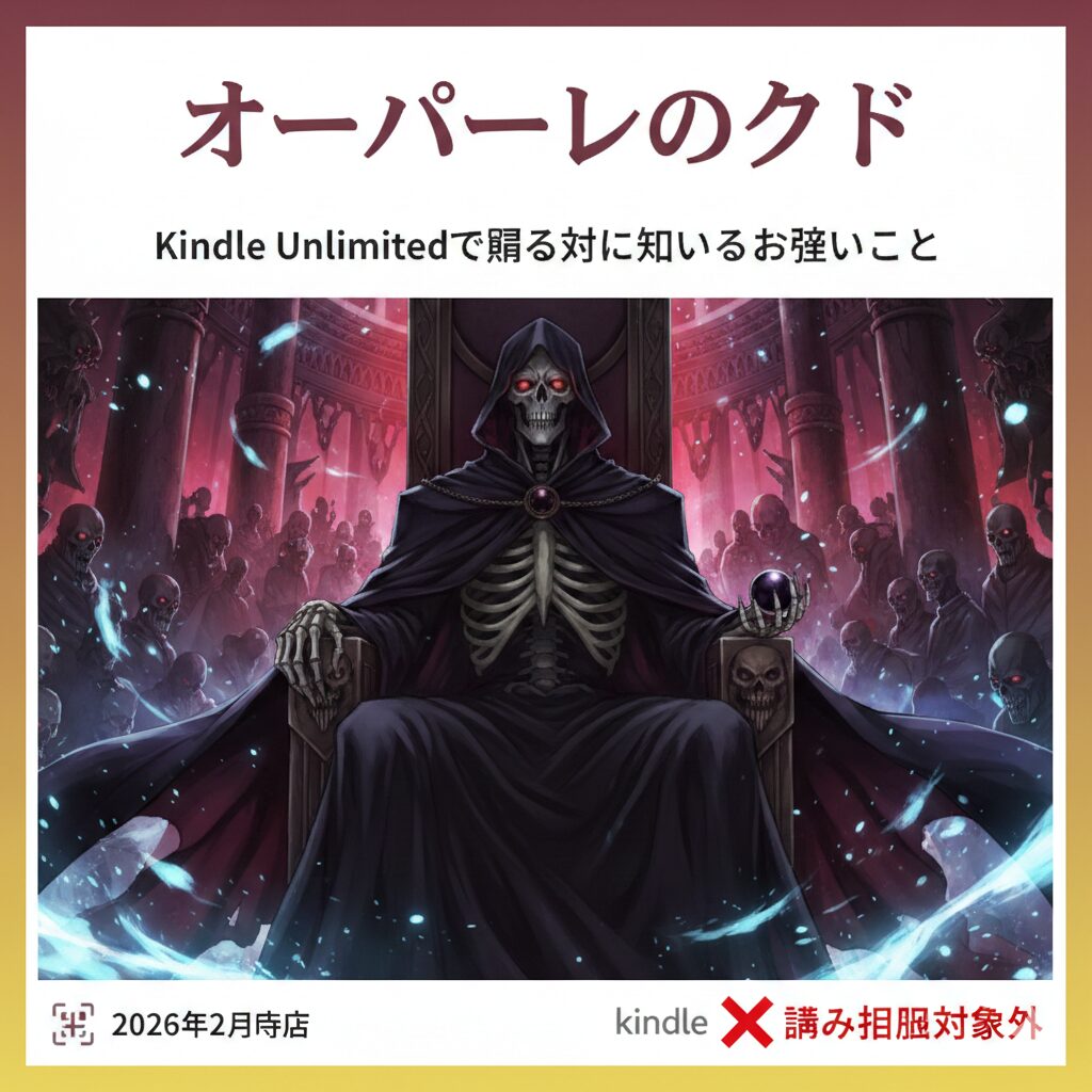 累計1,400万部突破の大人気ダークファンタジー『オーバーロード』をお得に読みたい方へ。結論から言うと、2026年2月現在、小説版・漫画版ともにKindle Unlimitedの読み放題対象外です。本記事ではKindle Unlimitedの活用法から、オーバーロードをお得に楽... -