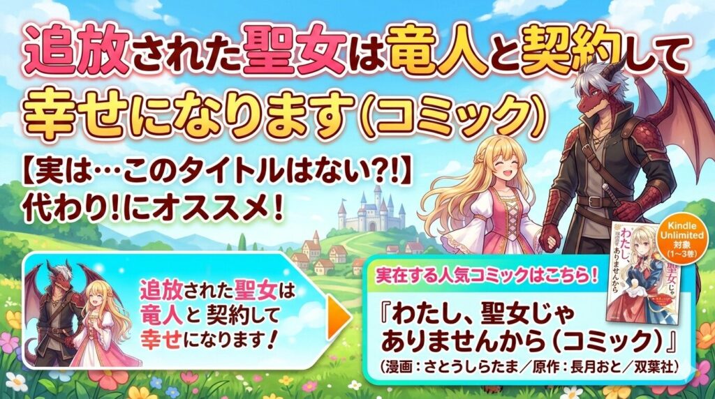 「追放された聖女は竜人と契約して幸せになります(コミック)」を探しているあなたへ。結論から言うと、この完全一致タイトルの作品は2026年2月時点で確認できませんが、ほぼ同じテーマの人気コミック『わたし、聖女じゃありませんから』がKindle Unlimit... -
