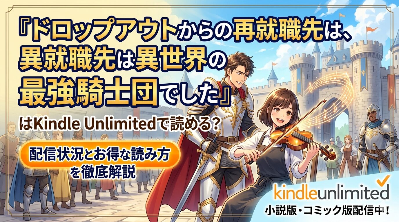 挫折したヴァイオリニストが異世界の最強騎士団で「楽士」として活躍する話題作『ドロップアウトからの再就職先は、異世界の最強騎士団でした』。コミック版・小説版ともにKindle Unlimited読み放題の対象として配信されており、月額980円(税込)で今すぐ読み始めることができます。