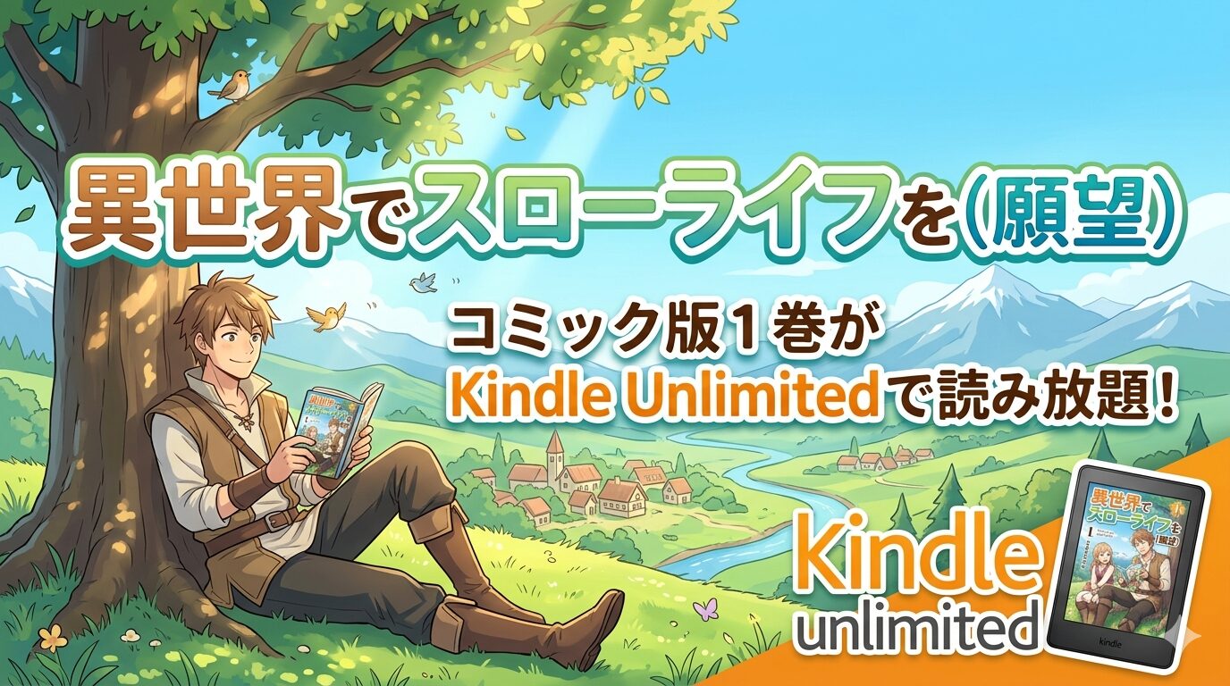 2026年3月時点で、「異世界でスローライフを(願望)」のコミック版(ガルドコミックス)は、1巻がKindle Unlimitedの読み放題対象として配信されています。2巻以降は個別購入が必要ですが、まずは1巻を読み放題で試してみて、続きが気になったら購入するという読み方がおすすめです。なお、Kindle Unlimitedの対象作品は随時変動するため、最新の配信状況は以下のリンクからご確認ください。