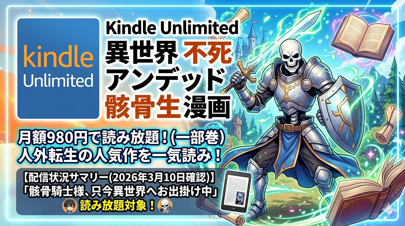 異世界に転生したら骸骨だった、不死者(アンデッド)になっていた――そんな「人外転生」ジャンルの漫画が近年大きな人気を集めています。結論からお伝えすると、「骸骨騎士様、只今異世界へお出掛け中」や「望まぬ不死の冒険者」など、不死・アンデッド・骸骨がテーマの異世界転生漫画の中にはKindle Unlimitedの読み放題対象作品があり、月額980円(税込)でお得に楽しめます。