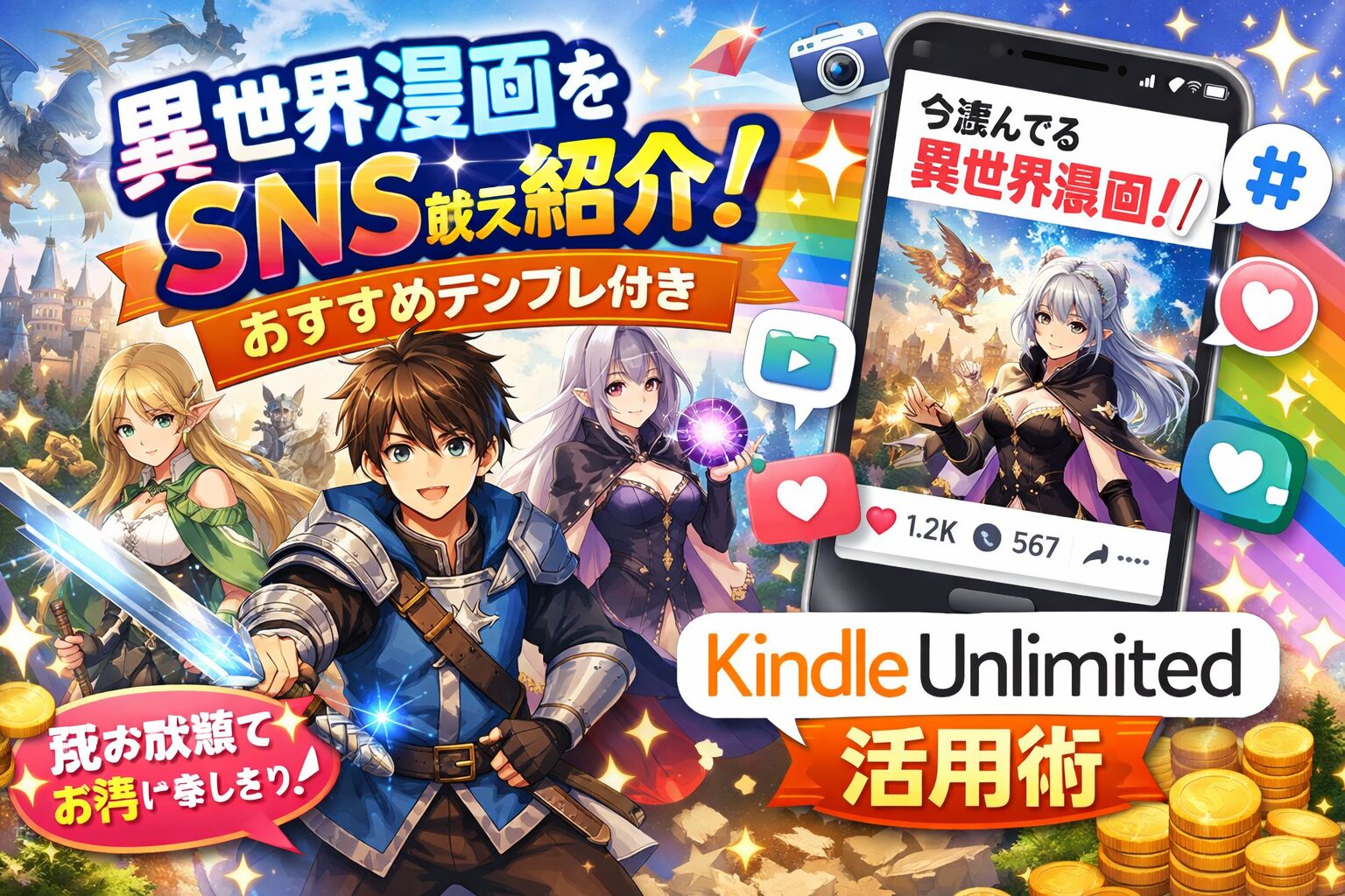 「異世界漫画をSNSで映える形で紹介したい」「読み放題でお得に読める作品が知りたい」——そんなあなたに向けて、Kindle Unlimitedで読める異世界漫画の中からSNS映えする作品を厳選し、そのまま使える紹介テンプレートとともにお届けします。月額980円(税込)の読み放題サービスを活用して、推し作品をどんどん発信しましょう。