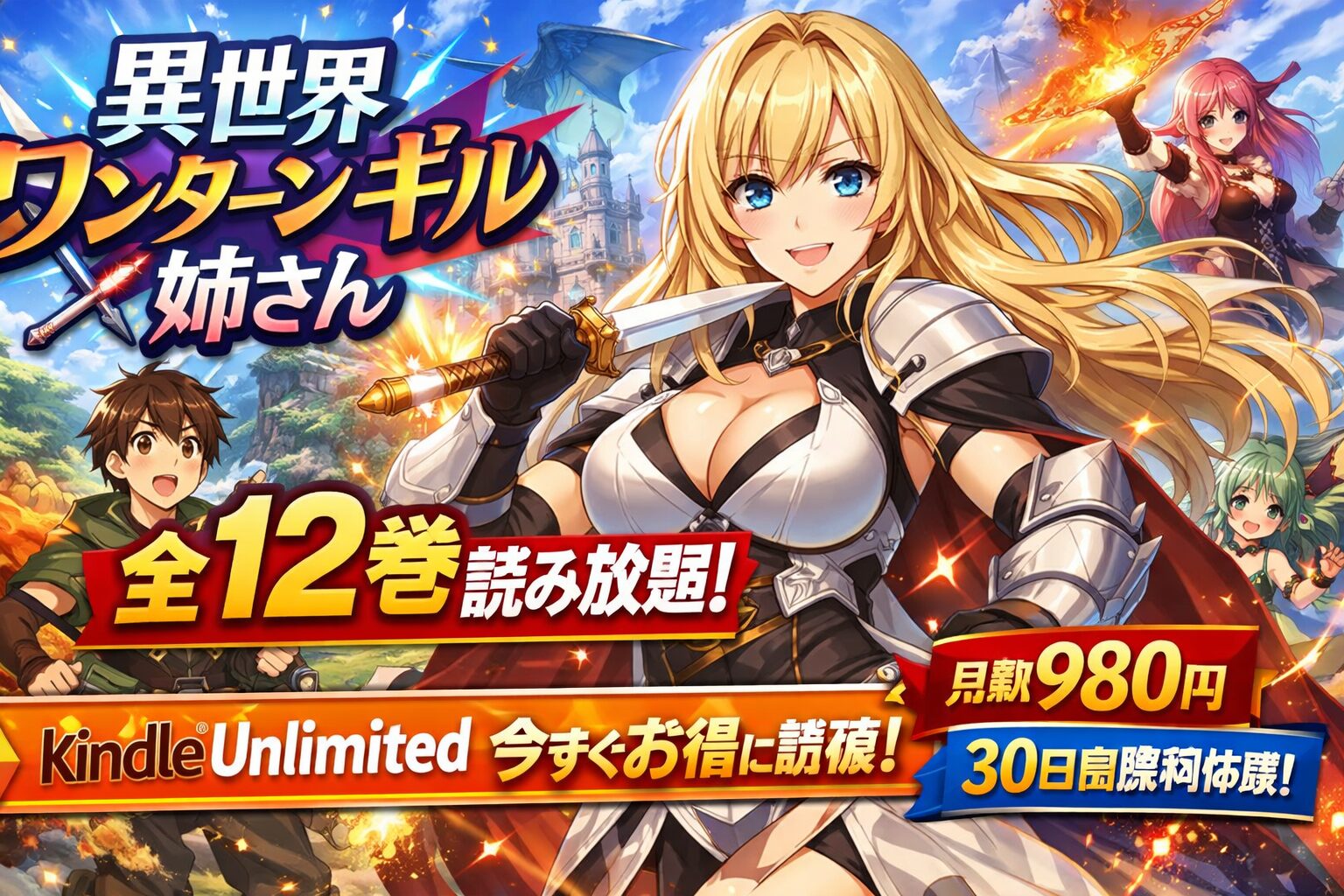 「異世界ワンターンキル姉さん」のコミック版は全12巻すべてがKindle Unlimitedの読み放題対象です。通常購入すると約8,316円かかるところ、Kindle Unlimitedなら月額980円(初回30日間無料)で全巻一気読みできます。この記事では、配信状況の詳細から作品の見どころ、読者の口コミ・評判、お得に読む方法まで徹底的に解説します。