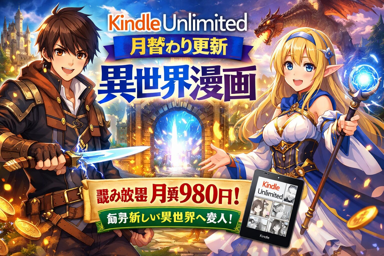 Kindle Unlimitedでは、月替わりで読み放題の対象作品が入れ替わるため、異世界漫画ファンにとっては毎月が「新しい異世界への扉」が開くタイミングです。月額980円(税込)で転生系・追放系・チート無双系など多彩なジャンルの異世界漫画が読み放題になるこのサービスは、なろう系ファンにとって最強のコスパを誇ります。