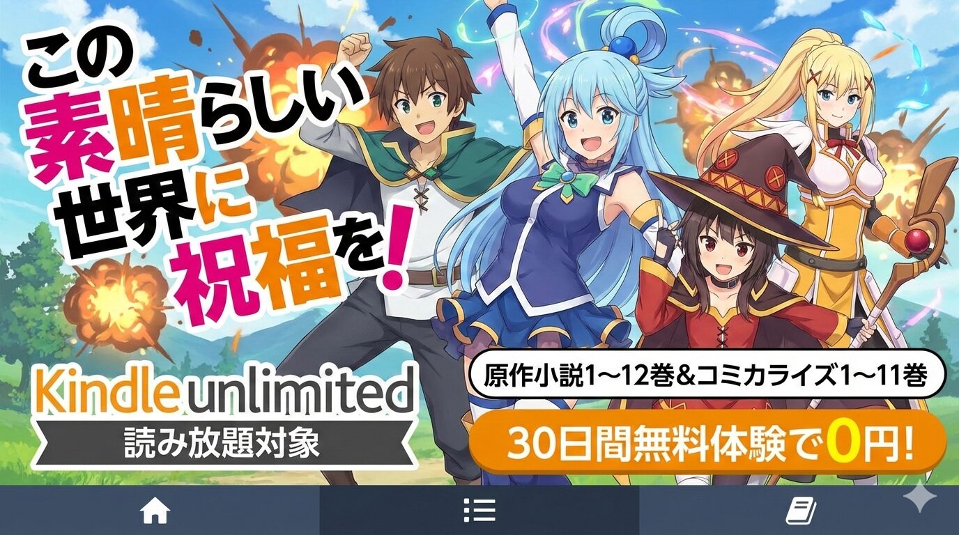 Kindle Unlimitedなら、原作小説1〜12巻とコミカライズ版1〜11巻を月額980円(税込)で読み放題。通常購入なら16,000円以上かかる作品群が、30日間の無料体験を使えば0円で楽しめます。アニメ4期の放送前に原作をチェックしておきたい方、異世界コメディの金字塔を一気読みしたい方は、ぜひこの機会にKindle Unlimitedで「このすば」の世界に飛び込んでみてください。