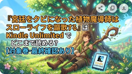 『宮廷をクビになった植物魔導師はスローライフを謳歌する~のんびり世界樹を育てたら、最強領地ができました~』は現時点ではKindle Unlimitedで何巻まで読める?Kindle Unlimited(Amazonの読み放題サービス)の表示を基準に、確認できた対象巻と読み進め方を整理します。