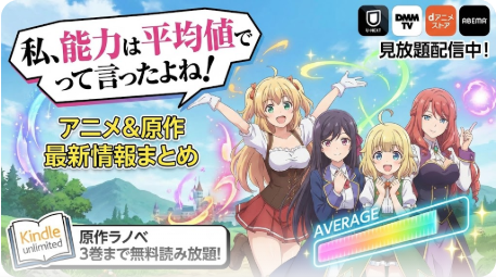 Kindle Unlimitedで原作小説1〜3巻を読み放題で楽しめます。30日間無料体験あり。アニメと合わせて「私、能力は平均値でって言ったよね!」の世界を堪能しましょう。