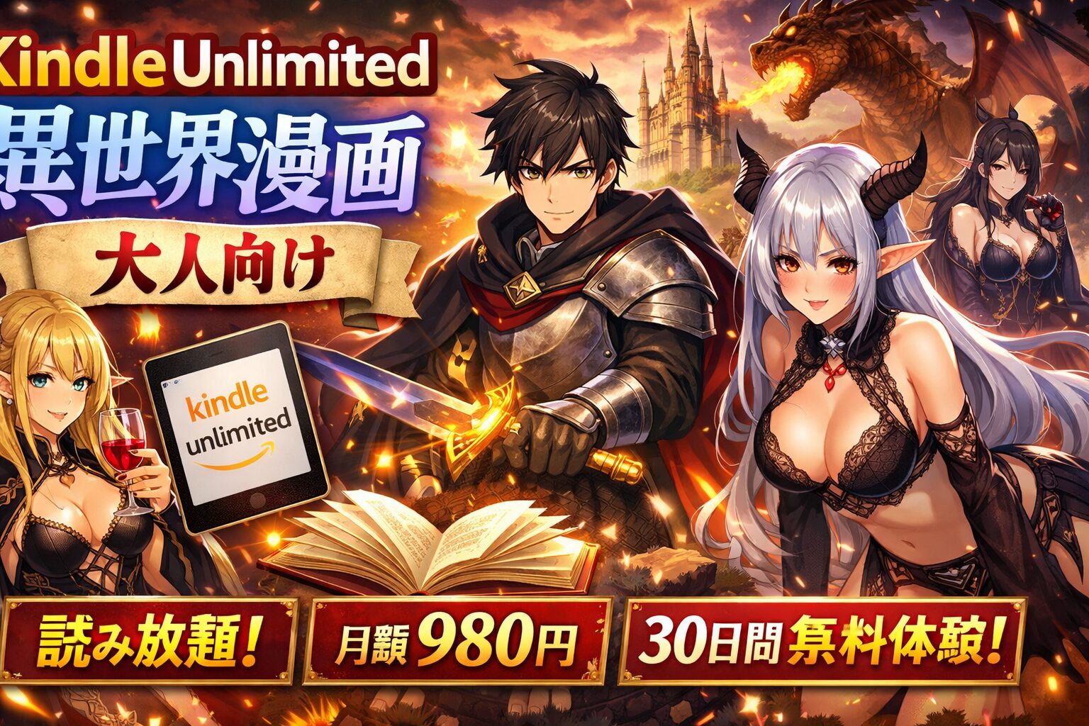 Kindle Unlimitedでは、大人向けの異世界漫画が数百タイトル以上配信されています。青年漫画レーベルの作品やお色気要素のある異世界漫画、おっさん主人公の作品など、幅広いラインナップが揃っています。対象作品は定期的に入れ替わるため、こまめにチェックするのがおすすめです。