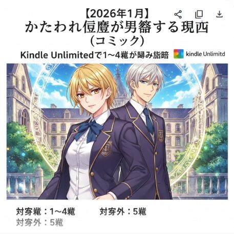 『かたわれ令嬢が男装する理由(コミック)』のKindle Unlimited対象巻を2026年2月確認済みの情報でまとめました。全5巻中1〜4巻が読み放題。逆行×男装学園ロマンスの人気作を30日間無料体験で今すぐ読めます。 -
