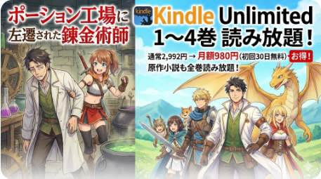 ポーション工場に左遷された錬金術師コミック版はKindle Unlimitedで1〜4巻が読み放題対象です。2026年2月確認済みの対象巻一覧・各巻の価格・原作小説との違い・最もお得に読む方法を30日間無料体験の情報とあわせてまとめました。 -