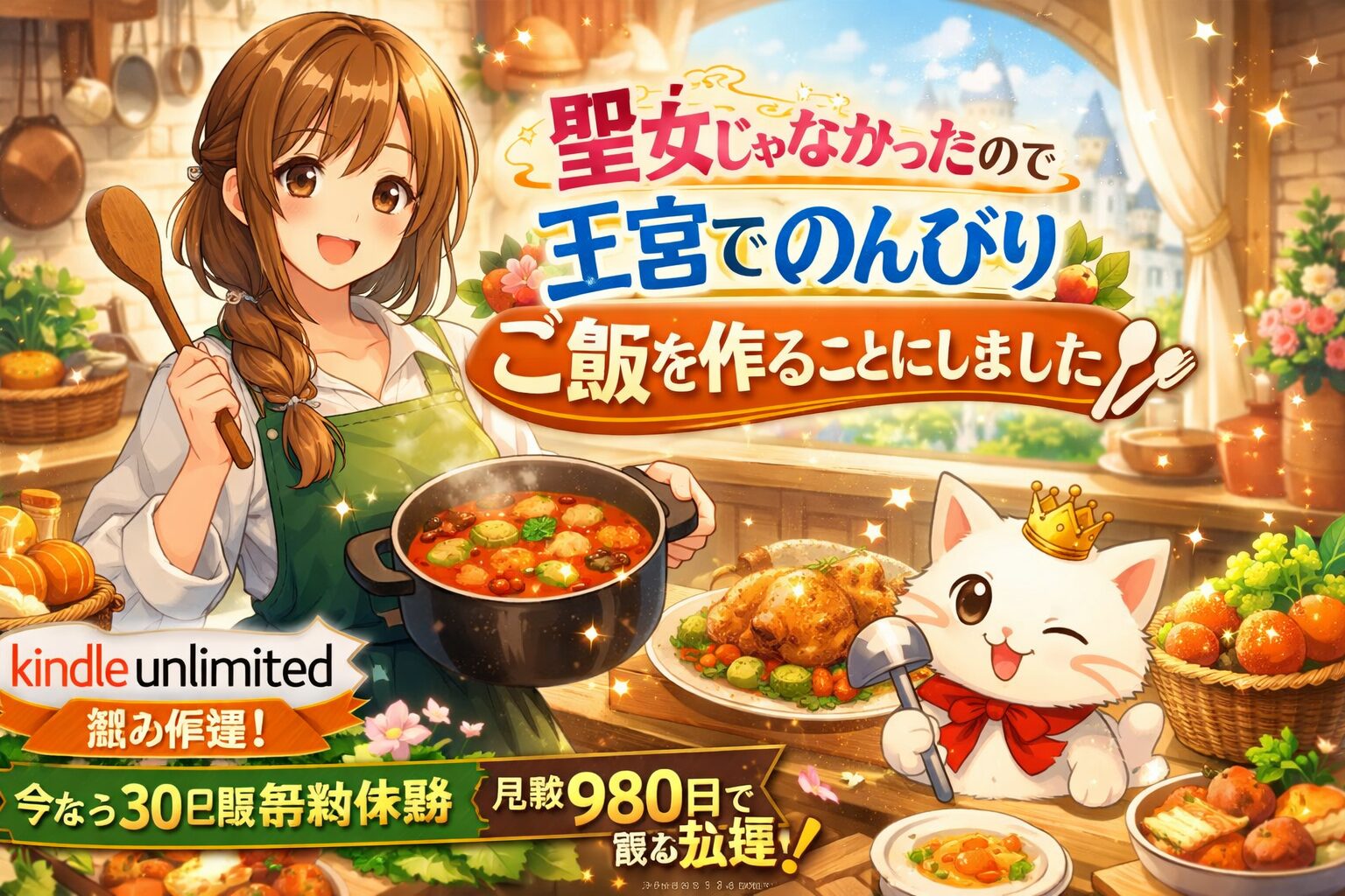 「聖女じゃなかったので、王宮でのんびりご飯を作ることにしました」は、異世界召喚×グルメ×コメディが絶妙に融合した人気作品です。小説版(カドカワBOOKS)の一部巻がKindle Unlimited読み放題の対象として配信されており、月額980円(税込)で気軽に読み始められます。30日間の無料体験を活用すれば、実質0円で試し読みが可能です。