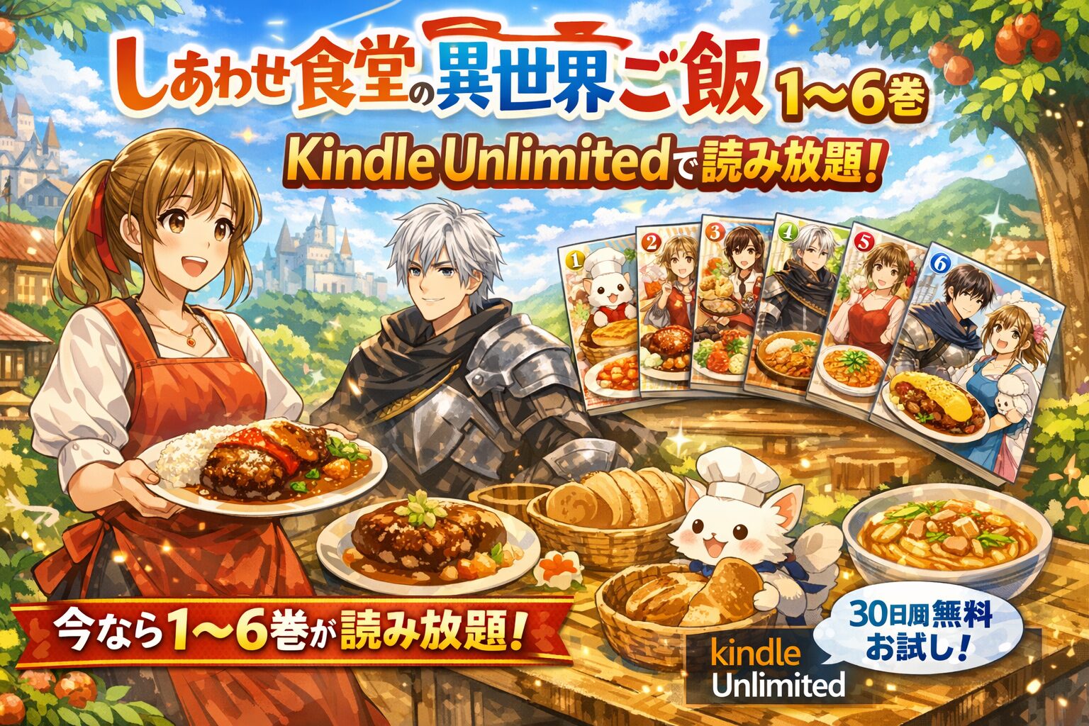 2026年3月現在、コミック版の1〜6巻がKindle Unlimitedの読み放題対象となっており、通常購入なら約2,800円以上かかるところを月額980円(税込)で一気読みできます。さらに30日間の無料体験を利用すれば、費用をかけずに本作の世界を存分に味わうことが可能です。「異世界×グルメ×恋愛」の三拍子が揃った本作を、ぜひこの機会にお得に楽しんでみてください。
