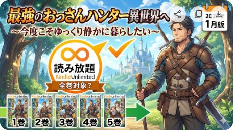 『最強のおっさんハンター異世界へ ~今度こそゆっくり静かに暮らしたい~』のKindle Unlimited対象巻を整理。読み放題で読める巻と、対象外になった巻をKindle版で読む手順を1ページでまとめます。