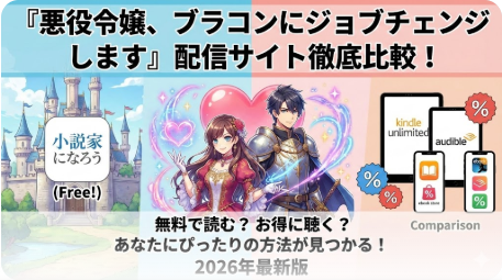 「悪役令嬢、ブラコンにジョブチェンジします」を無料で読む方法と全配信サイトを徹底比較。小説版1巻はKindle Unlimited読み放題対象、Web版は全358話無料。Audibleや各電子書籍サイトの料金・クーポン情報を2026年2月最新でお届けします。 -