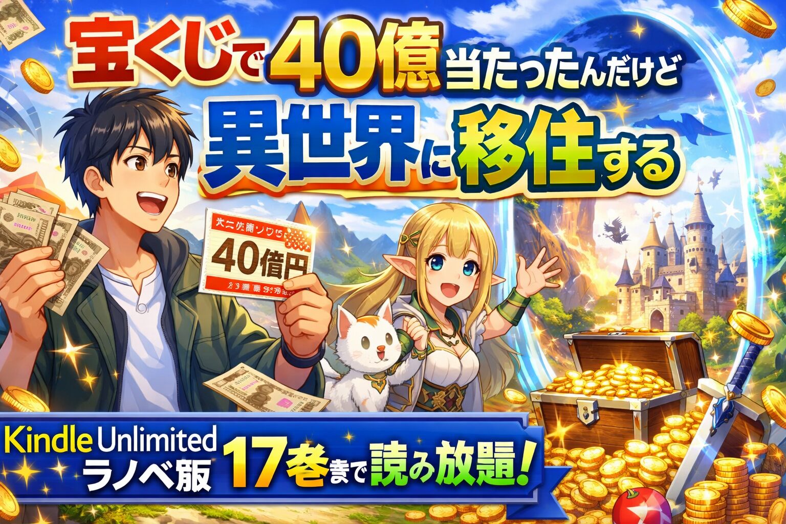 「宝くじで40億当たったんだけど異世界に移住する」のライトノベル版(モンスター文庫・全18巻)は、Kindle Unlimitedで17巻まで読み放題の対象です。漫画版(MFC・KADOKAWA)は読み放題対象外ですが、一部巻が期間限定で無料配信されることもあります。まずは無料体験でラノベ版を一気に読んでみるのがおすすめです。