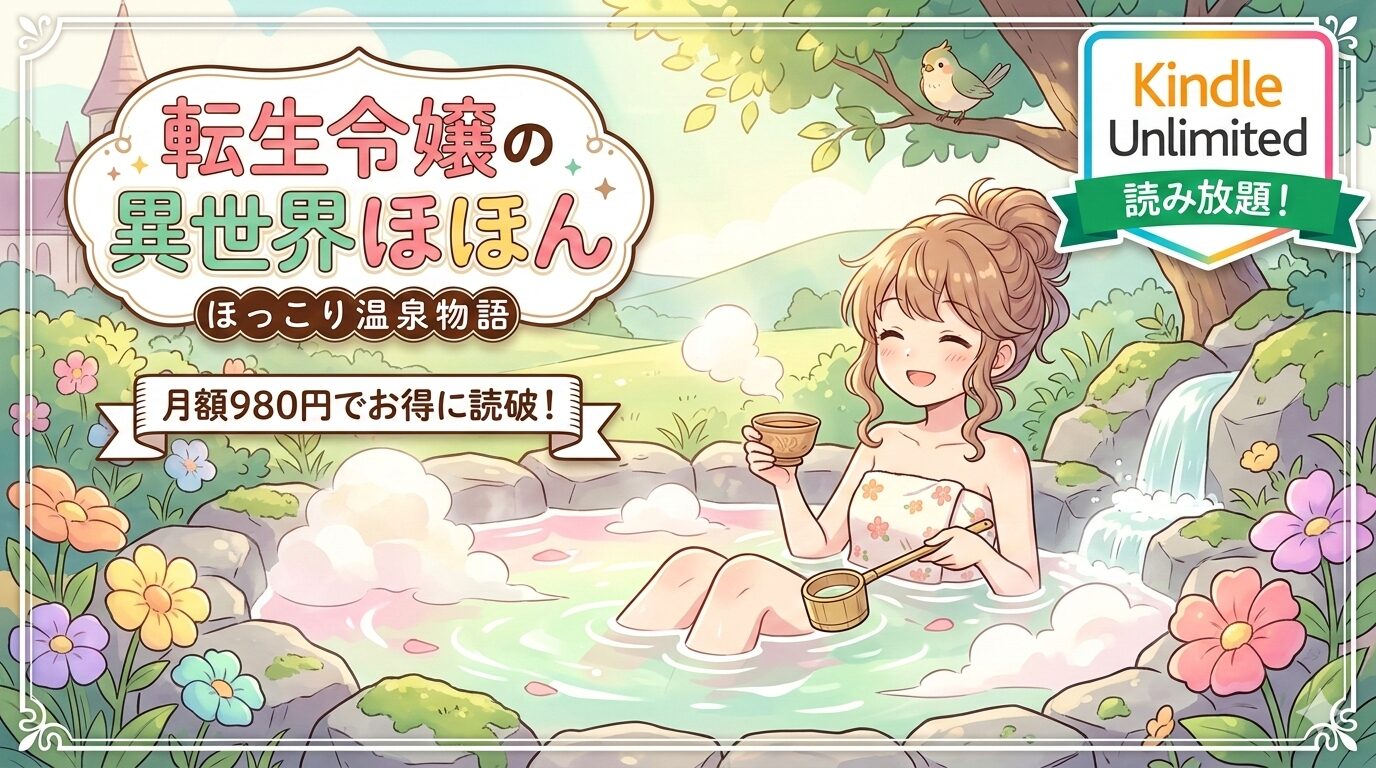 「転生令嬢の異世界ほほん」と検索している方に結論からお伝えすると、関連作品『転生令嬢の異世界ほっこり温泉物語』は小説版・コミック版ともにKindle Unlimitedの読み放題対象として配信されています。月額980円(税込)で全巻読めるため、非常にお得に楽しめます。