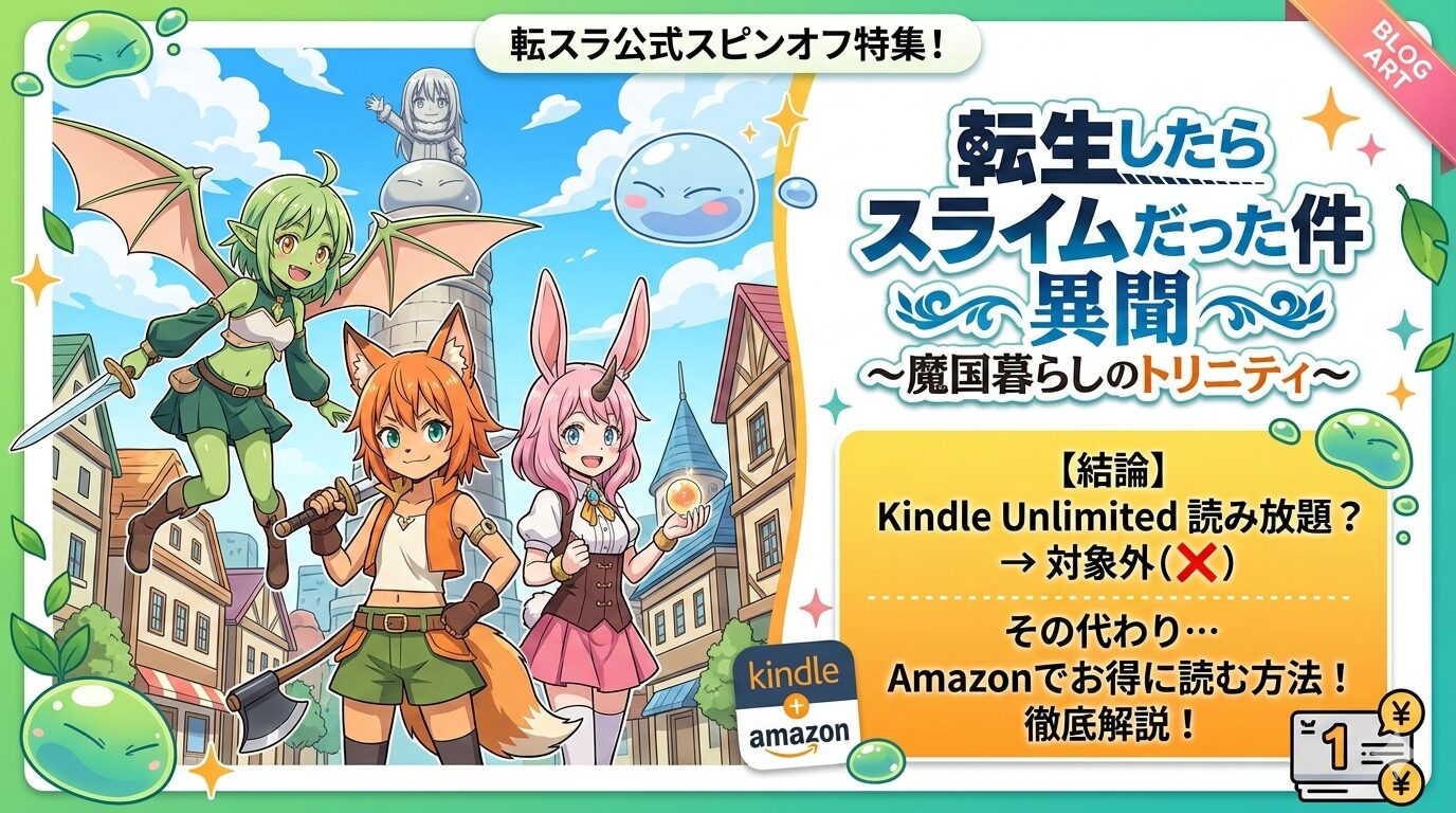 「転生したらスライムだった件 異聞 ~魔国暮らしのトリニティ~」(通称:転スラ トリニティ)をKindle Unlimitedで読めるか気になっている方へ。結論から言うと、本作は2026年2月22日時点でKindle Unlimitedの常時読み放題対象には含まれていません。ただし、Amazonでお得に読む方法は複数あります。この記事では、配信状況・全巻をお得に読む方法・口コミ・見どころまで徹底解説します。