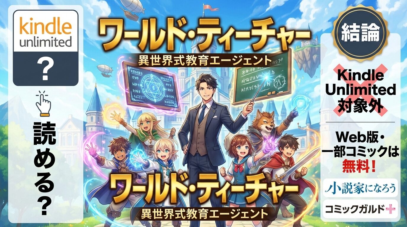 結論からお伝えすると、『ワールド・ティーチャー -異世界式教育エージェント-』はラノベ版(オーバーラップ文庫・全16巻完結)・コミック版(ガルドコミックス・全16巻)ともにKindle Unlimitedの読み放題対象外です(2026年2月24日確認)。月額980円の読み放題プランでは本作を読むことができません。ただし、原作となるWeb版は「小説家になろう」で全206話が完全無料で公開されており、コミック版もコミックガルド+で一部話数を無料で読むことが可能です。